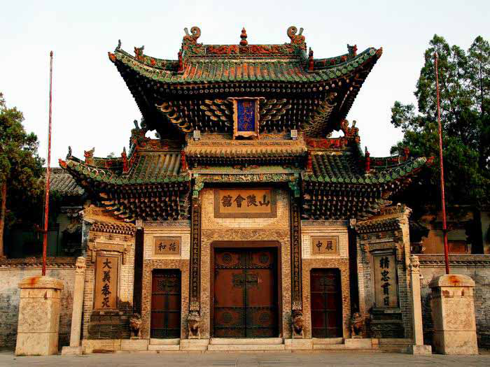 山陜會館的大門是三間牌坊式門樓,上方懸掛的豎匾“協(xié)天大帝”,是說關公是協(xié)助上天統(tǒng)御萬眾的神。下方的木質浮雕垂花門罩,雕刻著白象、版權所有聊城聊之旅旅行社有限公司,轉載必究!駱駝、麒麟等佛教吉獸和托塔天王李靖等佛教天王。大門高3米,寬2.3米,兩側的對聯(lián)是歌頌關公的,“本是豪杰作為,只此心無愧圣賢,洵足配東國夫子;何必仙佛功德,唯其氣充塞天地,早已成西方至人?!币馑际钦f:關公的所作所為己經是一位豪杰了,而他的思想和品德就算和圣賢相比,也是無愧的,足可以和東方魯國的孔夫子相媲美;您何必修仙拜佛呢,關公并沒有那樣做,但他的浩然正氣卻能夠充塞于天地之間,早已成為最完美的人了。對聯(lián)將關羽的地位放在頂點,以和孔子相匹配,體現(xiàn)出濃郁的地方特色。兩邊的小門上方各有石刻匾額一方,體現(xiàn)出儒家思想的中庸之道:“履中”是說做人應該行為中正;“蹈和”是講接人待物應該和氣,在這里也可以體現(xiàn)出商人講究和氣生財的處世哲學。