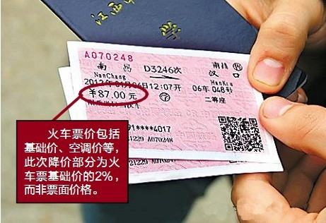 那么,火車票到底會降多少錢,是否就是原票面金額的2%?“之前大部分媒體都誤讀了新的票價計算規(guī)則,并非簡單以票面價乘以2%?!辫F路部門人士指出,火車票包含多種價格構成,因此票價計算較為復雜,按照鐵道部規(guī)定,目前分三種方式進行調價。