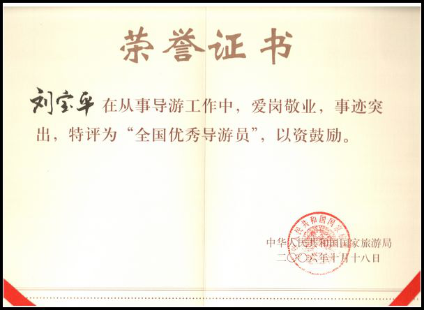 2006年公司董事長(zhǎng)劉寶平獲得中華人民共和國(guó)國(guó)家旅游局授予的“全國(guó)優(yōu)秀導(dǎo)游員”稱號(hào),并受到吳儀副總理的親切接見。全國(guó)優(yōu)秀導(dǎo)游員帶隊(duì)管理,相信我們能為您提供最優(yōu)秀的旅游服務(wù);