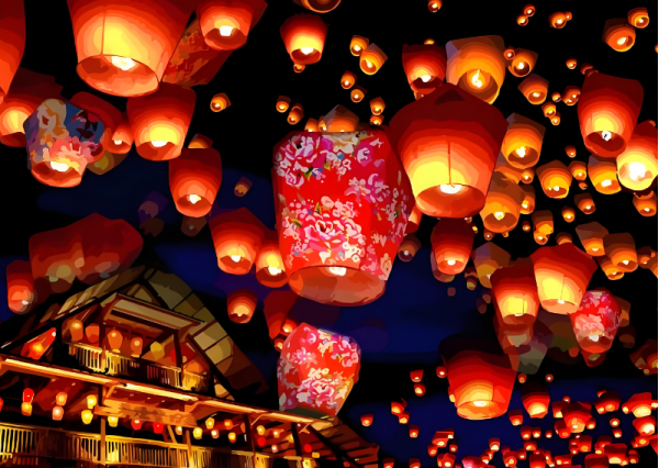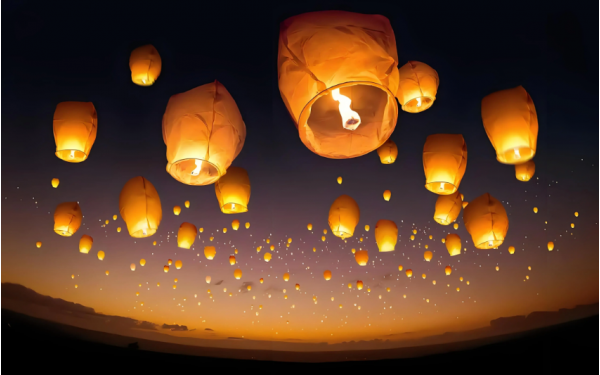 “放天燈”,來由是過去人們在躲避盜匪侵襲而四散逃逸之后,以燃放天燈為互報平安的信號。由于避難回家的日子正是元宵節(jié),從此以后,每年這一天,人們便以放天燈的儀式來慶祝,所以又稱天燈為“祈福燈”或“平安燈”。其后逐漸演變?yōu)橄蛏咸炱砀TS愿的民俗活動。天燈上寫滿了心里的各種祈愿,希望天燈能上達(dá)天庭,帶給人無限的希望和光明。