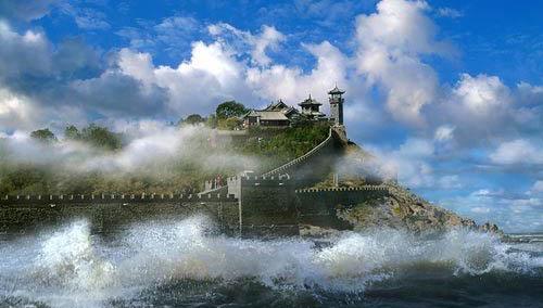 進(jìn)入仙境自然有神仙顯靈,現(xiàn)在大家看到的就是顯門。顯靈門是天后宮的宮門。天后宮里供奉的是海神娘娘,過去漁民最崇敬的就是海神娘娘,常來這里祈禱海神娘娘保佑出海平安無事。我們先往西走,到龍王宮去參觀一下。唐貞觀年間在山頂建有龍王廟,宋嘉佑六年移至現(xiàn)在的地方,現(xiàn)在大家看到的龍王宮是1984年重建的。走進(jìn)龍王宮的前殿,大家看到的呢東為定海神,西為靖海神。他們可是龍王的左右護(hù)法。