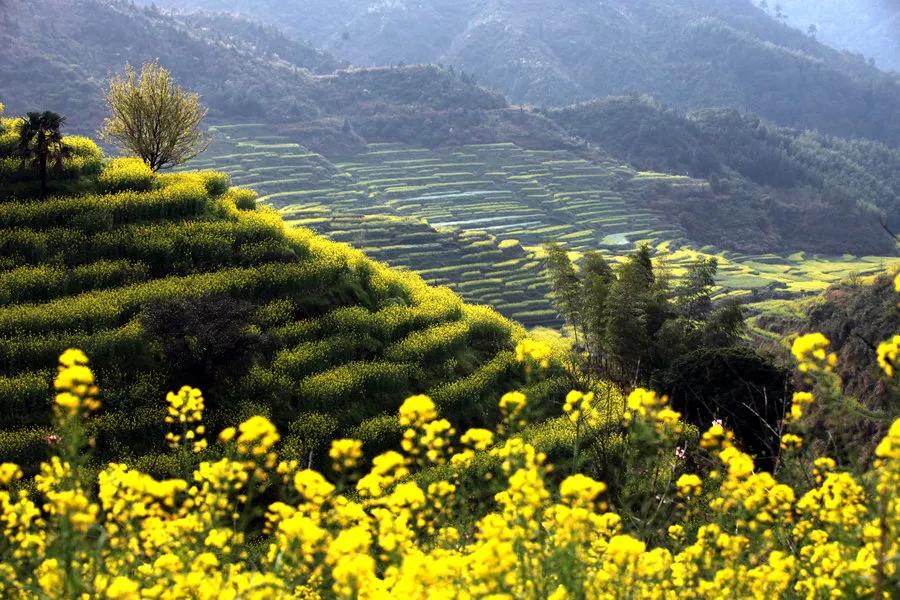 江嶺南臨曉起,東接溪頭,地處婺源縣最東北,是婺源最值得去的地方。站在山頂望去,腳下大片的山谷內(nèi),油菜花層層疊疊,一望無(wú)際,中間圍攏著幾個(gè)小小的村落,黑瓦白墻的徽派民居夾雜在一片金黃之間。