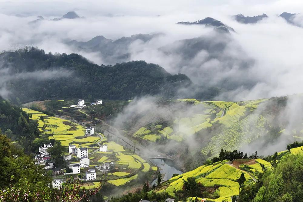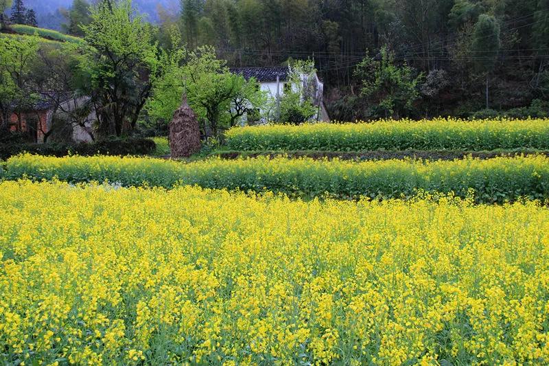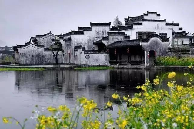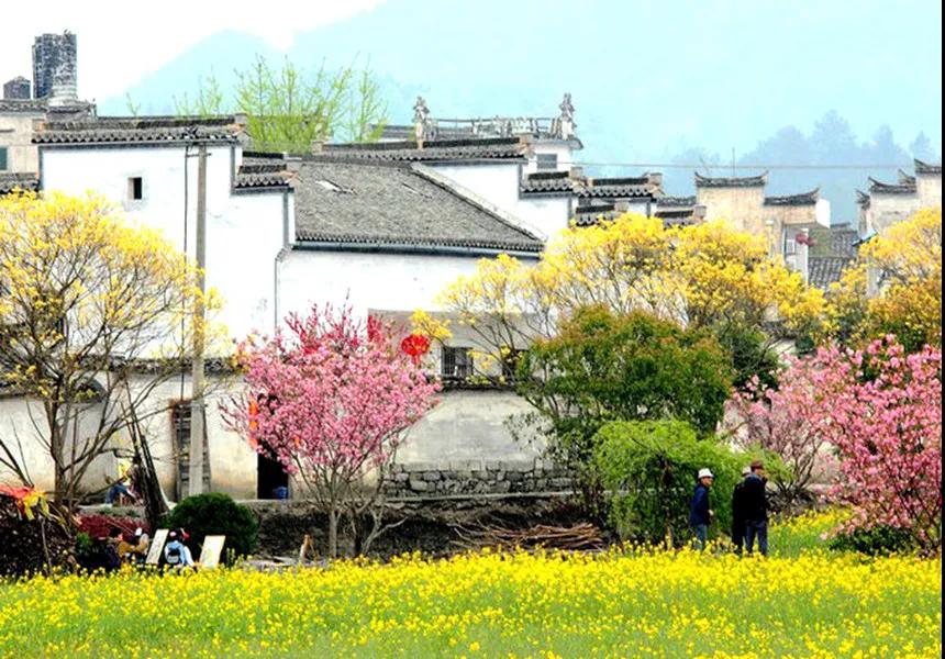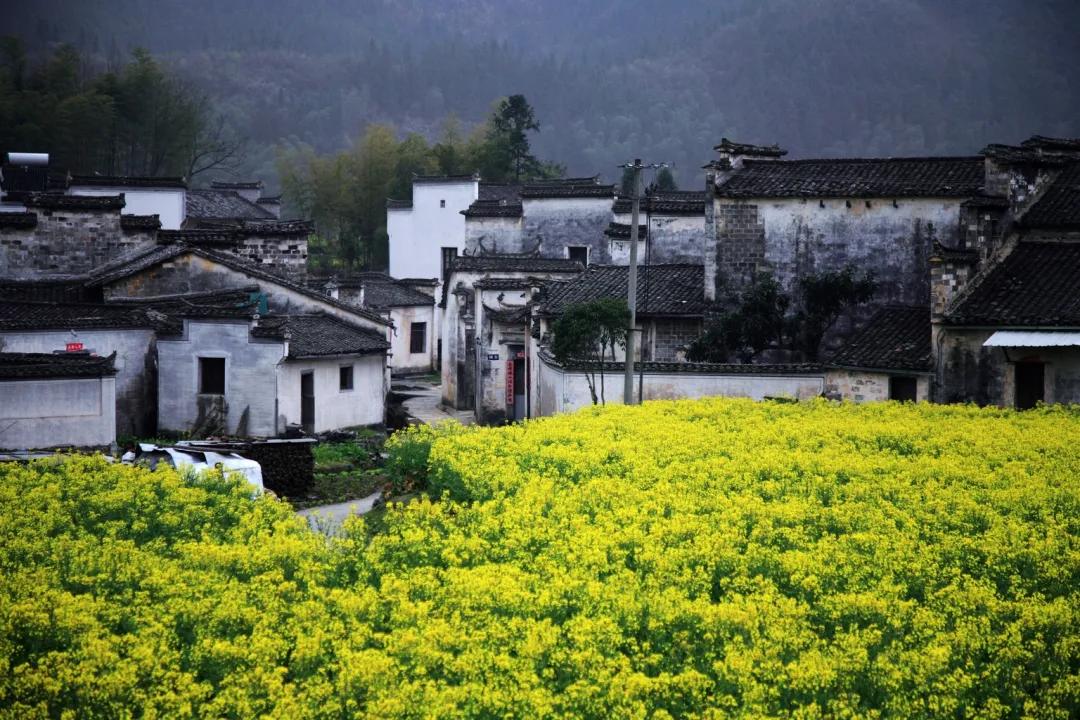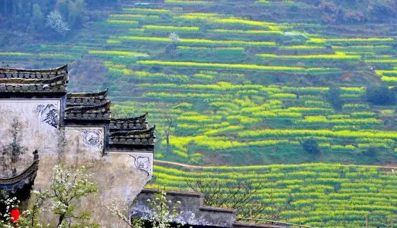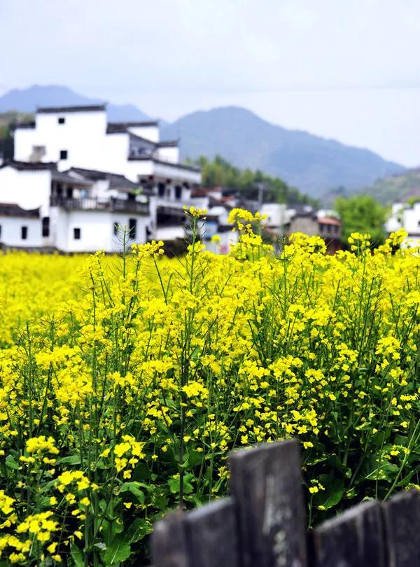春天來(lái)臨時(shí),漫天金黃的油菜花將水墨色的徽派建筑照耀著,白墻青瓦反射著微黃色的光,細(xì)看之下,還有幾枝桃花點(diǎn)綴其中。村里裊裊炊煙一直飄到了青色的山上,與山上的煙霧糾纏在一起。這大概才是徽州真正的模樣。