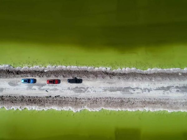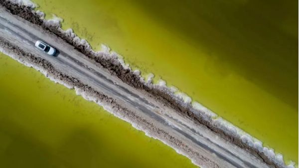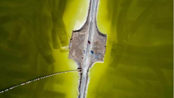 這座“鹽橋”,旁無護欄,下無橋墩,也無流水,從空中看,就像是直接橫叉在湖面上,它將鹽湖從中間劈成兩半,似乎沿著這條路走下去,就能達(dá)到神仙的住所。