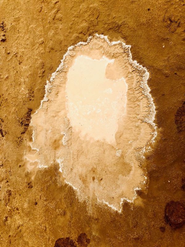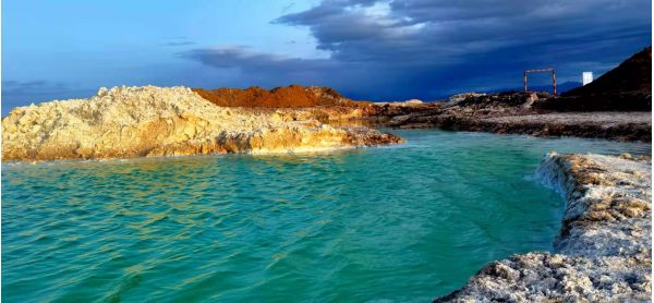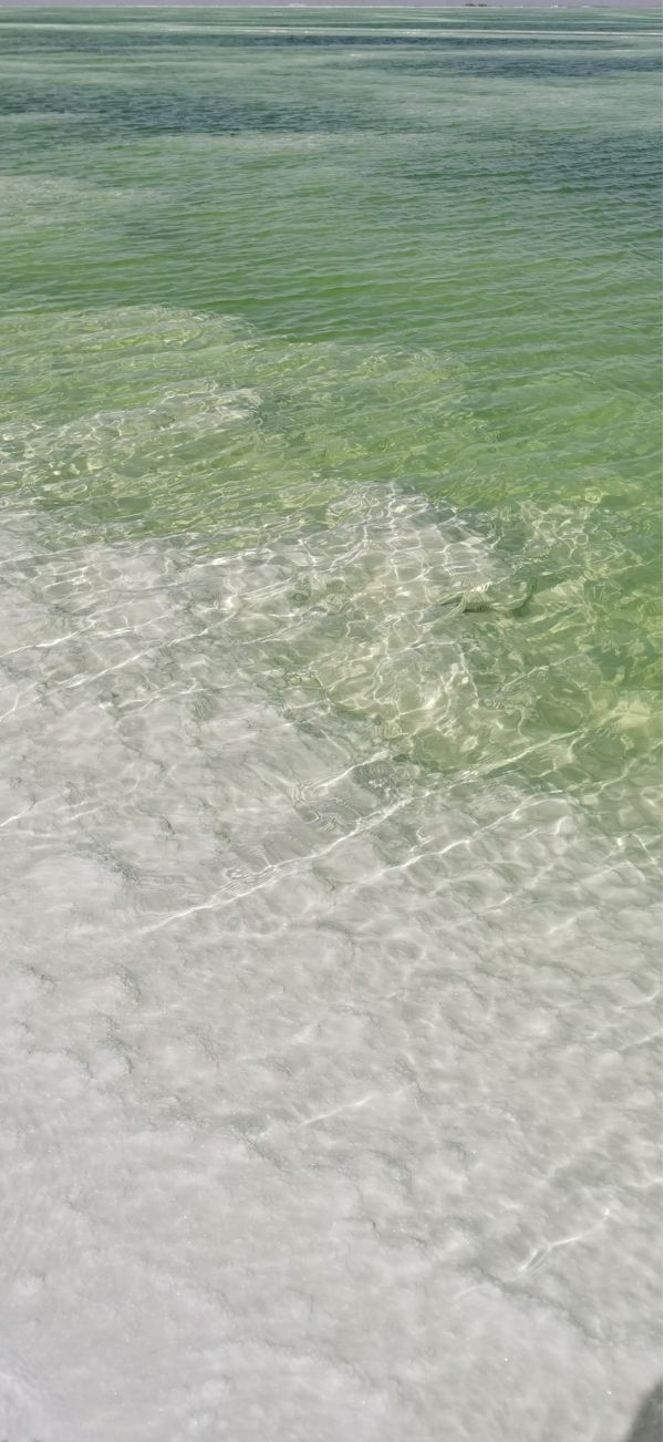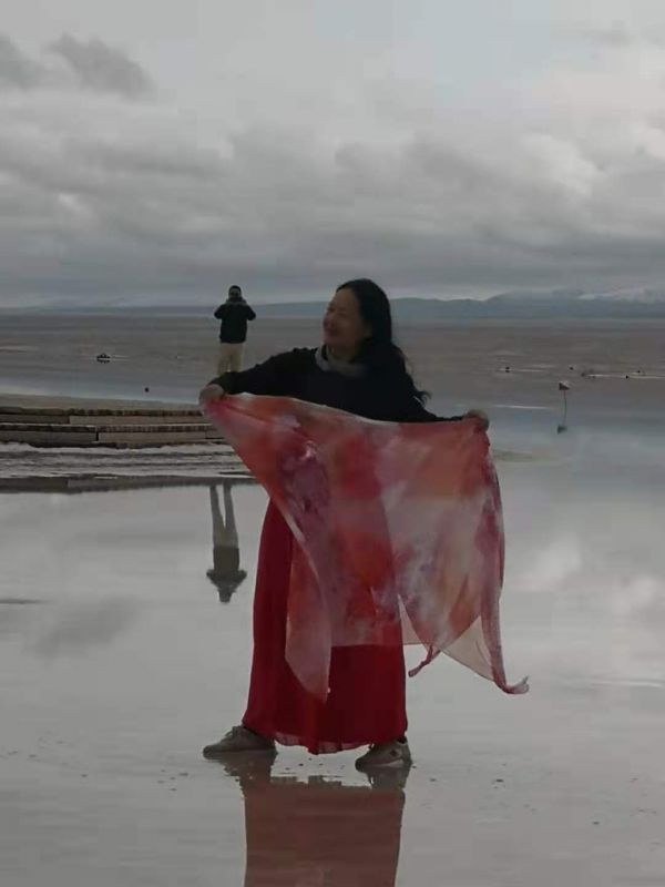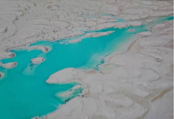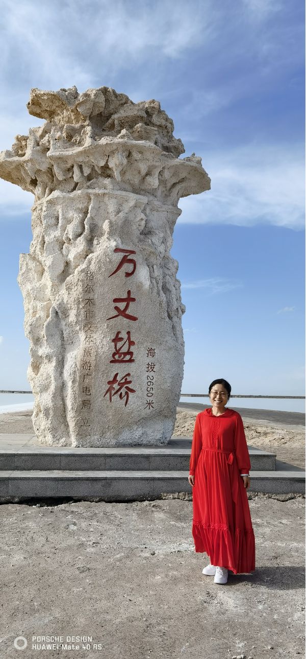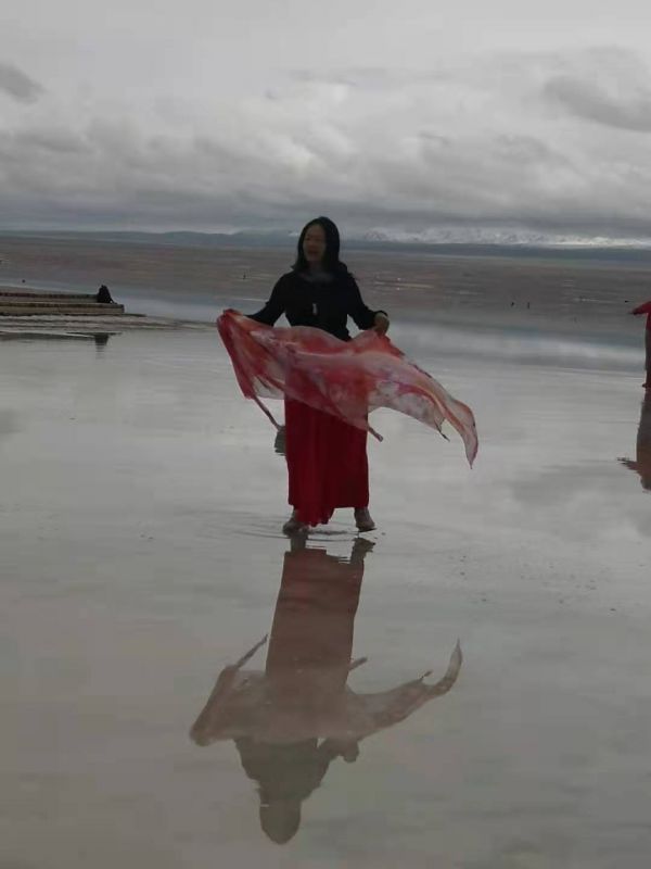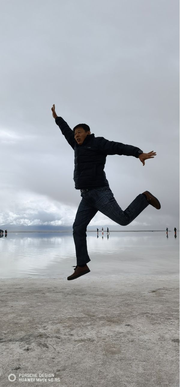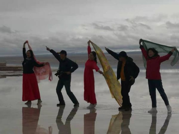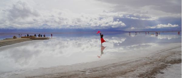 時(shí)速大約相當(dāng)于人的走路的兩倍到三倍,咣當(dāng)咣當(dāng)?shù)故遣坏⒄`欣賞一路風(fēng)景。目的地就是當(dāng)年鹽場(chǎng)采鹽的鐵路的盡頭。鹽水很淺,風(fēng)平浪靜,翠綠的鹵水倒影著遠(yuǎn)處的雪山,風(fēng)景剎是美麗,水也就是能沒到腳面,租他的膠鞋和紅色的裙子可以到鹽湖里面拍攝。紅色的裙子倒影非常漂亮,遠(yuǎn)處的云彩黑白相間。一朵一朵相擁而來,紅色的裙子,翠綠色的湖水,藍(lán)色的天空白色的雪山,真是如入仙境,大家操作無人機(jī)上下左右拍了無死角,兩個(gè)多小時(shí)瞬間過去,說好的是5點(diǎn)返程,6點(diǎn)了大家還意猶未盡,流連忘返。