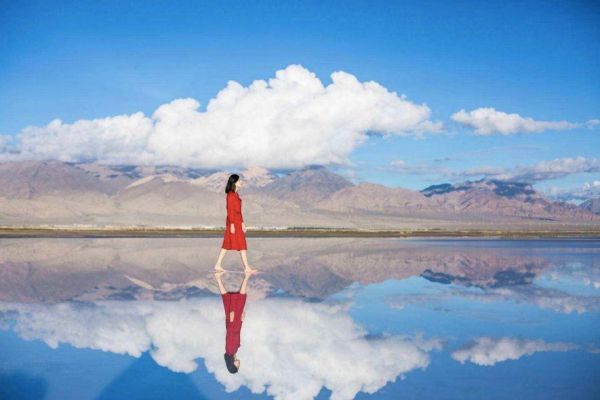 鹽湖湖面時(shí)而碧水蕩漾,時(shí)而蒼蒼莽莽、一片潔白,四周牧草茵茵,羊群似珠,遠(yuǎn)處林木崢嶸,雪山含玉,天空碧藍(lán)悠遠(yuǎn),白云朵朵,倒映在湖水中。鹽湖的“鏡”與“凈”,置身其中,會(huì)讓你有種想要展翅飛翔的感覺(jué)。在那里,時(shí)間仿佛靜止般,天地間是一片純凈的白與藍(lán),就像做了一場(chǎng)幻境般的夢(mèng)……這么美麗的風(fēng)景,怎么拍出來(lái)網(wǎng)紅大片呢?一起來(lái)看~
