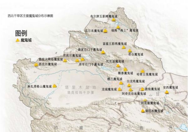 從地圖上我們可以明顯看到,北疆是魔鬼城的主要分布區(qū)域,甘肅、青海也有少量分布,實(shí)際上,在西北資料可查的雅丹地貌群就近百余處,它們一個(gè)個(gè)神秘地屹立在西北疆域上,成為了寂寞荒原上的一場(chǎng)視覺(jué)盛宴,數(shù)量之多,形態(tài)之多,就像是一個(gè)神秘而龐大的“魔鬼”家譜,實(shí)際上,它們并不是被人類(lèi)遺棄或鬼神建造的“古城”,而是經(jīng)過(guò)風(fēng)蝕形成的一種特有地貌景觀,用我的話講就是被風(fēng)吹了多少年的一堆大土丘~可是深入其中,高高低低的“建筑群”投下錯(cuò)亂光影,在這里幾乎看不到任何生命的跡象,因?yàn)殍F含量過(guò)高,磁場(chǎng)不穩(wěn)定, 指南針進(jìn)入雅丹地貌經(jīng)常會(huì)不管用,尤其在夜深人靜,遇到風(fēng)吹,聲音似鬼哭狼嚎,極其陰森恐怖,故被稱(chēng)為“魔鬼城”。如果晚上在魔鬼城里露宿一夜,想必也會(huì)是一種奇妙的體驗(yàn)~