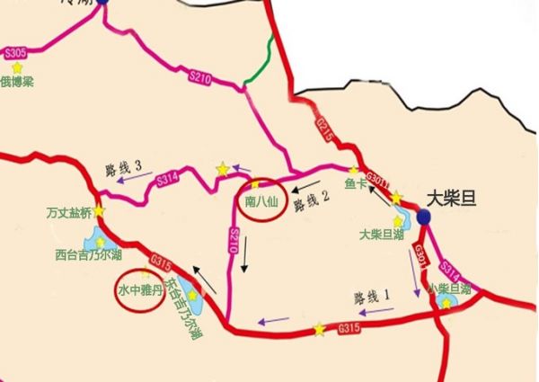 線路2:大柴旦南下高速G3011,沿“中國(guó)66號(hào)公路”之稱(chēng)的315國(guó)道一直向西,沿途路過(guò)察爾汗鹽湖,這條路線路程短,車(chē)稍多,注意車(chē)速。