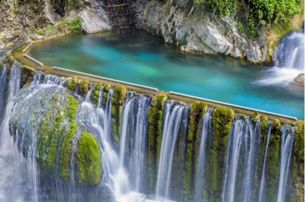 螺髻山九十九里溫泉不僅是世界第一大溫泉瀑布,還是世界唯一的掛壁溫泉、世界唯一的溫泉群島,由數(shù)十個(gè)大小不一的溫泉瀑布組合而成的一個(gè)寬達(dá)200余米的溫泉瀑布群。首先映入眼簾的是一泓清澈見底的大槽河,河流纏繞在青山綠水間,漫步在奔騰而下的大槽河畔,陣陣涼風(fēng)夾雜著水霧撲面而來(lái),郁郁蔥蔥的山嶺上百瀑飛瀉,雄奇的靈崖異石,成群的瀑布形態(tài)各異;順著河流而上,聲響如雷,一簾高31米寬19米掛在懸崖峭壁之上的溫泉瀑布呈現(xiàn)在了眼前,銀簾空懸而掛,蒸騰彌漫、熱霧繚繞;崖壁上的天然小水池,被稱之為“鴛鴦池”,沐浴其間,聽滴水彈琴,享靈崖泉韻,觀簾外景物,撲塑迷離,恍若大虛幻景。