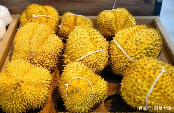 不要選細長尖刺的,要選粗短的,再用手把兩根尖刺捏在一起,如果能輕易靠攏,說明榴蓮已經(jīng)成熟。榴蓮最好選黃色或者姜黃色的,榴蓮底部是平的,果柄是新鮮的,有很濃郁的榴蓮香味,這樣的榴蓮一般都是新鮮飽滿的。