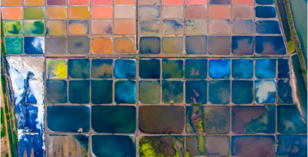 鹽田我們見得多了,像大名鼎鼎的茶卡鹽湖、烏尤尼鹽沼、翡翠湖等等,都屬于鹽場,雖然號稱天上的鏡子,但也沒有這么美,再加上鹽地都是四四方方的,連旁邊的鹽地都能看到顏色上的差別,簡直不可思議。