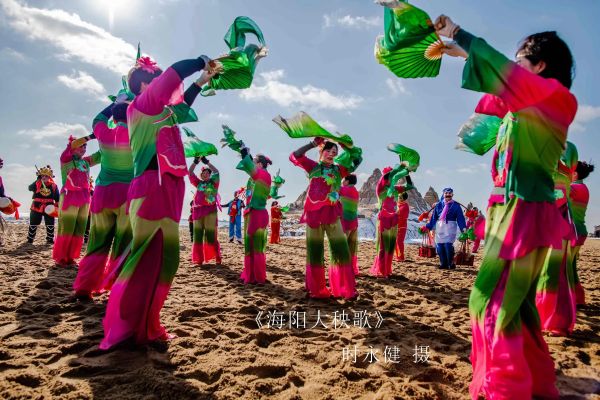 海陽大秧歌是山東省三大秧歌之一,是民間社火中的舞蹈部分,流行于山東半島南翼、黃海之濱的海陽市一帶。海陽大秧歌是一種集歌、舞、戲于一體的民間藝術(shù)形式,它遍布海陽的十余處鄉(xiāng)鎮(zhèn),并輻射至周邊地區(qū)。海陽大秧歌素以粗獷奔放、感情充沛、風(fēng)趣幽默的表演風(fēng)格著稱于世。在表演形式上,分大場子和小場子兩種,大場子是群舞,鑼鼓鏗鏘、萬馬奔騰,宛若大河滔滔。小場子多是雙人舞、多人舞,恰似小橋流水,一波三折,美不勝收。海陽大秧歌獨(dú)具的優(yōu)秀的民間藝術(shù)特色和濃郁的生活氣息,吸引了大批藝術(shù)家、學(xué)者及國內(nèi)外游客前來學(xué)習(xí)、觀賞。