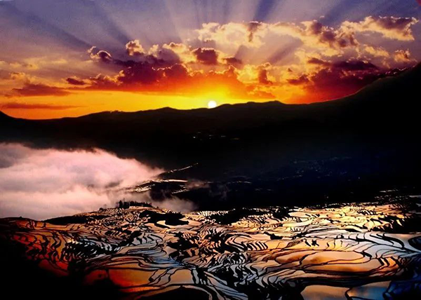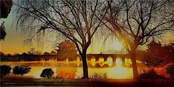 清晨,太陽(yáng)沖破地平線,陽(yáng)光從建水縣雙龍橋的橋孔下穿射而出,宛如油畫般的場(chǎng)景,就這樣展現(xiàn)在眼前
