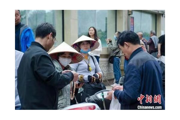 “我剛從越南過來,請幫忙開個張?!狈妒舷阌靡豢诹骼闹形牧幵缡小伴_門紅”,并向記者展示她的邊境通行證,她的單肩挎包里裝有紅木、黑檀、沉香等不同材質(zhì)的手串,手上也戴著數(shù)串向游客展示。范氏香說,她恢復(fù)這項營生已經(jīng)十來天,前一天賺了100多元(人民幣,下同)利潤。