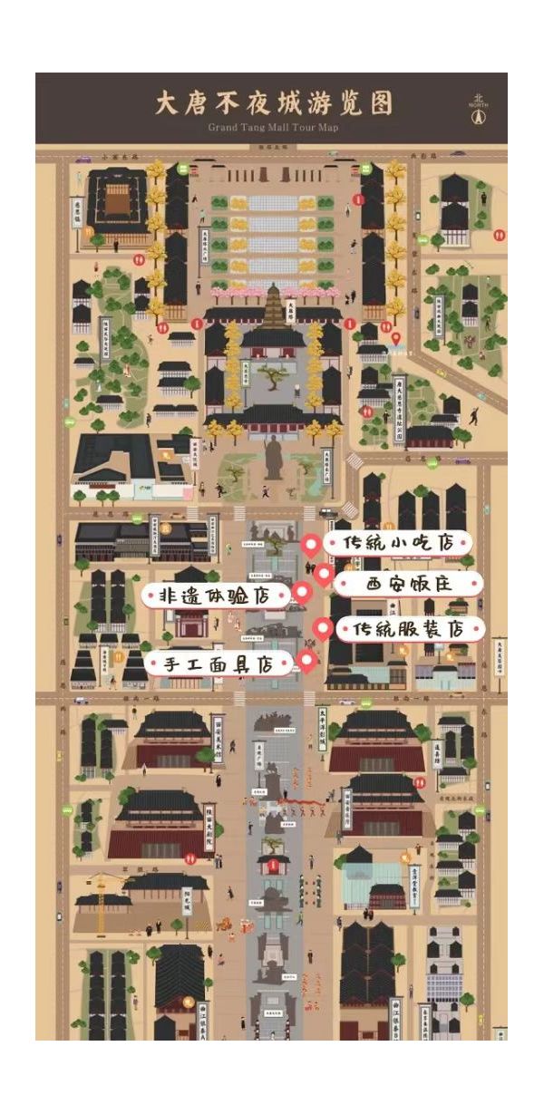 按照建設(shè)有中國(guó)特色、地方特點(diǎn)、國(guó)際水平步行街的總體要求,以國(guó)際化、人文化、特色化為目標(biāo),規(guī)劃形成了大唐不夜城步行街“一軸·兩市·三核·四區(qū)·五內(nèi)街”的總體布局。一軸:是指"大唐不夜城文化商業(yè)軸";兩市:是指"貞觀新風(fēng)韻唐市、創(chuàng)領(lǐng)新時(shí)代都市";三核:是指"大雁塔廣場(chǎng)景觀文化核心、貞觀文化廣場(chǎng)時(shí)尚藝術(shù)核心、創(chuàng)領(lǐng)新時(shí)代廣場(chǎng)休閑時(shí)尚核心";四區(qū):是指"大雁塔盛唐景觀人文風(fēng)貌展示區(qū)、中華傳統(tǒng)美食文化生活品鑒區(qū)、貞觀國(guó)際藝術(shù)文化交流體驗(yàn)區(qū)、創(chuàng)領(lǐng)新時(shí)代都市休閑文化區(qū)"。五內(nèi)街:是指"慈恩鎮(zhèn)-陜西風(fēng)情小吃文化街、新樂匯-中華傳統(tǒng)美食文化街、歐凱羅-潮流音樂酒吧文化街、溫德姆-品味生活咖啡文化街、陽(yáng)光城-SKP時(shí)尚青年藝術(shù)文化街"。
