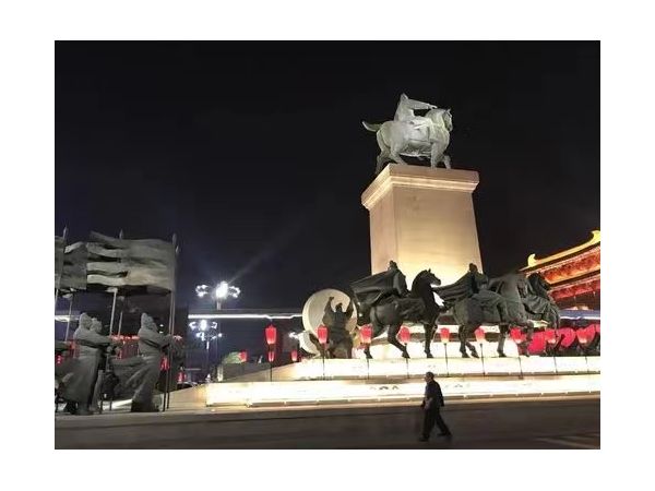 大唐不夜城整體布局為線性布局,以大雁塔南廣場(chǎng)到古城墻遺址之間的連線為軸線,由北向南分別為商業(yè)步行街、貞觀廣場(chǎng)、文化交流廣場(chǎng)、慶典廣場(chǎng)、古城墻遺址公園五個(gè)景觀區(qū)域。