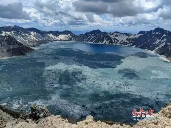 由于今年氣溫偏低,天池開冰又屬于“文開”,6月16日,冰封半年的長白山天池正式開冰,天池全面融化的時間在22日,經(jīng)歷了7天的時間。湖面上的冰層隨著氣溫的升高,逐漸變薄、破碎、融化,猶如美麗的少女揭開神秘的面紗。作為一個獨特的天氣現(xiàn)象,深受攝影師和廣大游客的喜愛。