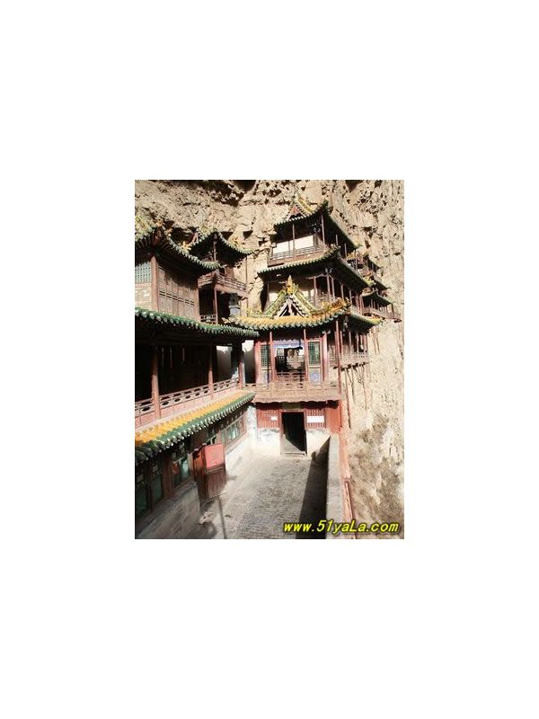 北岳恒山風(fēng)景區(qū)內(nèi)的另一處重要景觀是懸空寺。懸空寺位于北岳恒山腳下、渾源縣城南5公里處的金龍峽內(nèi)西巖峭壁上。寺創(chuàng)建于北魏后期(約為公元471—523年),現(xiàn)存建筑分明清兩代修建后的遺物。懸空寺靠西面東,儼若精巧、別致、玲瓏剔透的玉雕懸于一幅巨大的屏風(fēng)上。寺內(nèi)共有殿宇樓閣40間。南北,有三檐歇山頂危樓聳起,對(duì)峙而立,由低向高三層疊起,離地百余尺,附于絕壁上,三面環(huán)廊國(guó)抱、六座殿閣,相互交叉,飛架棧道相連,高低錯(cuò)落,木制樓梯溝通,遷回曲折,構(gòu)思布局妙不可言、整個(gè)寺面似虛而實(shí),似危而安,實(shí)中生巧,危里見(jiàn)俏,一種在國(guó)內(nèi)其它寺廟中體會(huì)不到的奇險(xiǎn)感緊緊地抓住游人的好奇心理。懸空寺內(nèi)塑像頗多,有銅鑄、鐵鑄、泥塑、石雕像共78尊。三圣殿內(nèi)的泥塑,具有唐、明兩代風(fēng)韻,釋迎、韋馱、天女、阿難形體豐滿(mǎn),神彩動(dòng)人,仙女婀娜、韋馱英武、阿難虔誠(chéng),各具風(fēng)彩。三教殿內(nèi),釋迦牟尼、老子、孔子三教臺(tái)流,共居一室,耐人尋味、始祖同堂,堪稱(chēng)中國(guó)宗教史上的一段佳話(huà)。懸空寺內(nèi),有朝殿、會(huì)仙府、碧霞宮、純陽(yáng)宮、樓臺(tái)亭、寢宮、梳妝樓、御碑亭等。