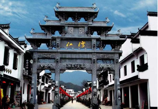 山環(huán)水繞的江灣鎮(zhèn)自然風景格外秀美,整個村子布局規(guī)整,一街六巷,縱橫交錯。主街入口佇立著高大巍峨的牌坊,牌坊后的樹木如士兵般列隊整齊,走在街上,古樸優(yōu)雅,自成一景。