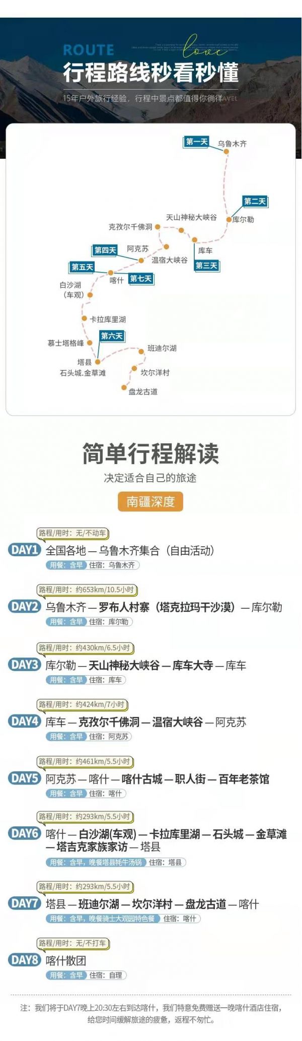 當(dāng)天車(chē)程較長(zhǎng),從北疆穿越天山甘溝進(jìn)入南疆腹地,氣候變化較大,請(qǐng)適當(dāng)增減衣物,注意補(bǔ)充水分??商崆百?gòu)買(mǎi)一些零食,以備不時(shí)之需。