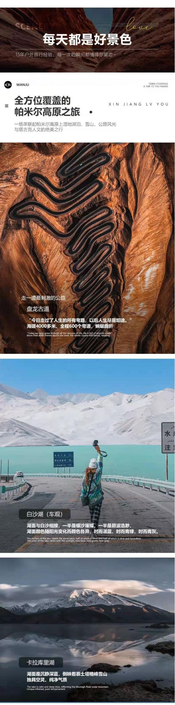 “今日走過(guò)了人生的所有彎路,以后人生盡是坦途。”這是出現(xiàn)在新疆帕米爾高原盤(pán)龍古道兩頭的宣傳語(yǔ)。繼續(xù)前行,我們會(huì)遇見(jiàn)著名網(wǎng)紅打卡地【盤(pán)龍古道】。這條70多公里的馬路,卻有600多個(gè)彎道,海拔最高有4000多,從山頂俯瞰整個(gè)古道,蜿蜒曲折,遠(yuǎn)方還有連綿不斷的雪山,視覺(jué)效果十分震撼。