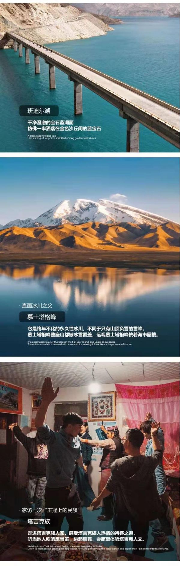 告別“東方摩洛哥”—喀什,我們將開(kāi)啟一段帕米爾高原之旅。沿314國(guó)道一路暢游帕米爾高原風(fēng)光,首先驚艷我們的是背靠白色沙丘和雪山的【白沙湖】,在陽(yáng)光的變化下,湖水時(shí)而呈湛藍(lán)色,時(shí)而呈綠色。更令人驚嘆的是,藍(lán)色的湖面與白沙相接,一半藍(lán)一半白,而白沙背后還有雪山。在雪山和白沙的映襯之下,白沙湖水更顯澄澈。在這里能get湖泊、白沙、雪山同框的畫(huà)面。分享一個(gè)冷知識(shí):白沙湖又名流沙河,就是西游記里唐僧收服沙和尚的地方。我們還能途觀(guān)慕士塔格峰,山頂常年皚皚白雪,猶如滿(mǎn)頭白發(fā),十余條冰川鑲嵌在峰體下的峽谷中,如胸前飄動(dòng)的銀須,故有“冰山之父”的美稱(chēng)。隨后我們將遇見(jiàn)【卡拉庫(kù)里湖】,這里能看到雪山倒映在湖面的風(fēng)景,拍出來(lái)的照片特別的給人純凈的感覺(jué)。