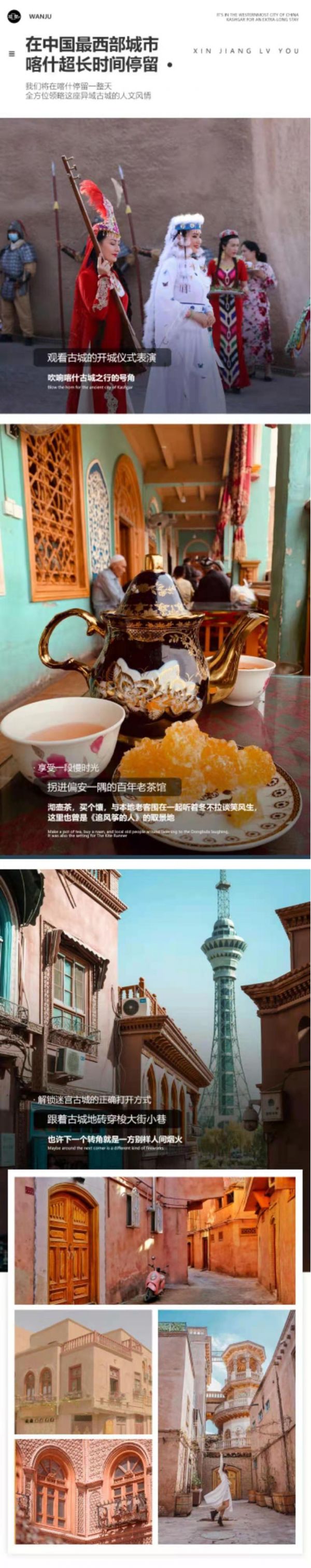 今天我們將去到中國(guó)最西部的城市—【喀什】,用整整一天的時(shí)間去領(lǐng)略這個(gè)“你未曾前往,但始終向往”的城市魅力。來(lái)喀什必須要逛逛【喀什古城】,喀什老城每天有兩個(gè)開(kāi)城儀式表演,時(shí)間分別是:早晨10:30 下午18:00,向來(lái)自五湖四海的朋友們展示自己熱情的好客之道。之后我們進(jìn)入古城漫步在古城的街道,老城區(qū)街巷縱橫交錯(cuò),布局靈活多變,曲徑通幽,民居大多為土木、磚木結(jié)構(gòu),不少傳統(tǒng)民居已有上百年的歷史,是中國(guó)以伊斯蘭文化為特色的迷宮式城市街區(qū)。這里巷道狹窄彎曲,奇特的過(guò)街樓、小胡同、手工作坊隨處可見(jiàn),生土建筑比比皆是,被中外游客譽(yù)為“維吾爾族活的民俗博物館”,是喀什這座中國(guó)歷史文化名城的內(nèi)涵所在。