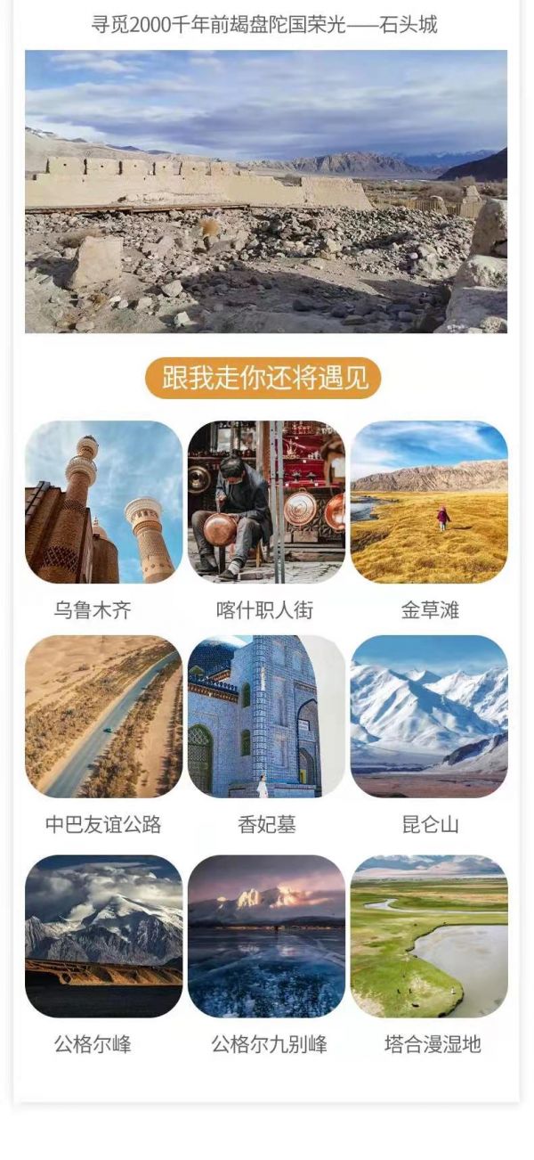 喀什古城·塔克拉瑪干沙漠·盤(pán)龍古道·羅布人村寨·溫宿大峽谷·克孜爾千佛洞·天山神秘大峽谷·白沙湖(車(chē)觀(guān))·石頭城·金草灘·坎爾洋村·卡拉庫(kù)里湖·塔吉克家族人文體驗(yàn),南疆深度行攝8日