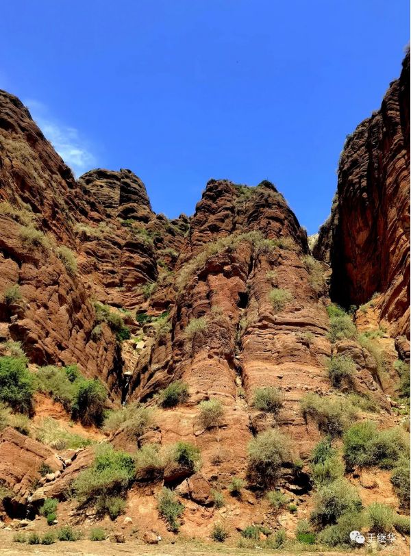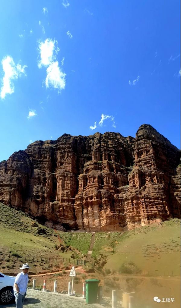 這個(gè)景區(qū)叫赤壁西湖,山峰是紅色,它的紋理比較特別,山水畫里邊兒28種存法,也表現(xiàn)不完全的風(fēng)貌。,縱橫交錯(cuò),成成疊疊,點(diǎn)點(diǎn)滴滴,宏偉總不乏婉約,剛硬中不乏圓潤(rùn)。在藍(lán)天白云的映襯下,別有一番風(fēng)味兒。