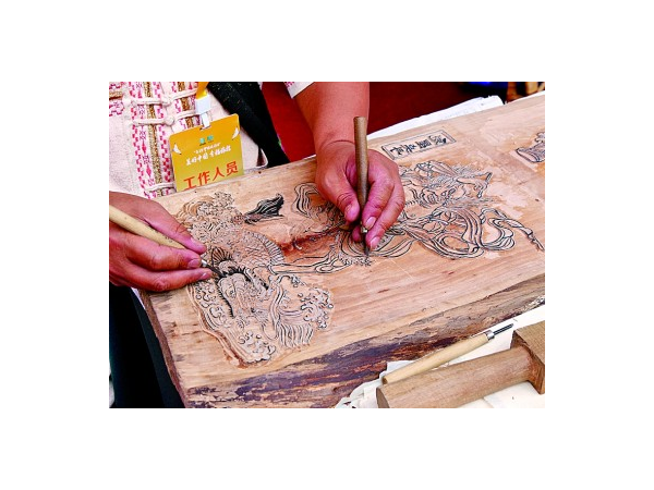 騰沖農(nóng)民畫(huà)傳承人賈明安在雕刻甲馬印版。