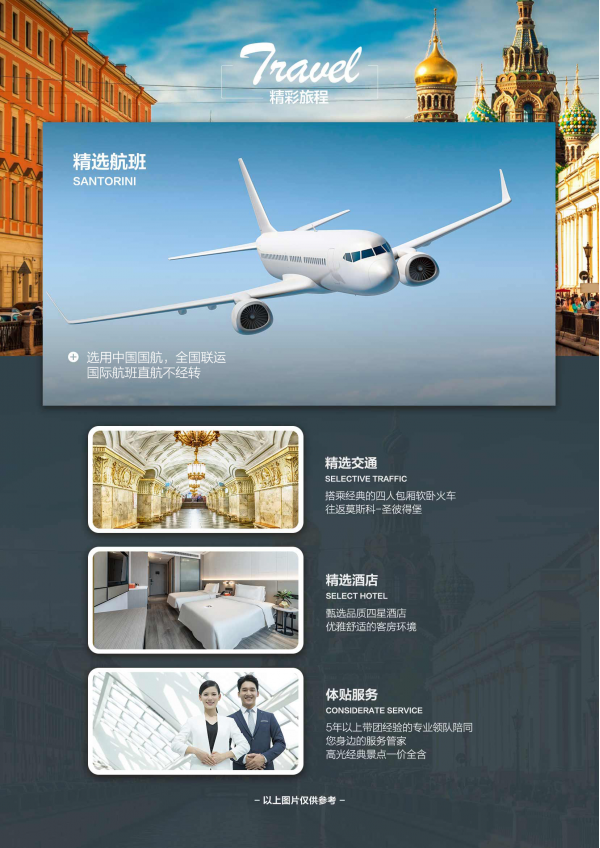 游覽結(jié)束后,前往機(jī)場(chǎng)乘坐國(guó)際航班返回北京,結(jié)束美好的俄羅斯之旅。