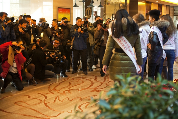 各路記者和攝影師們一起在阿爾卡迪亞國(guó)際酒店拍攝世界旅游小姐: