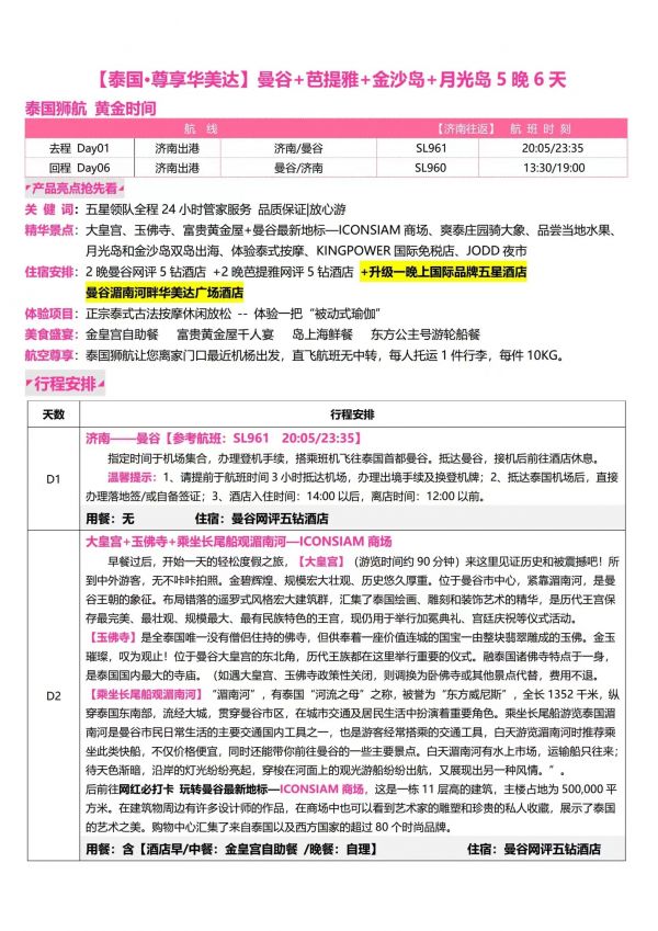泰國6天5夜游 聊城出發(fā) 純玩 無購物 曼谷 芭提雅 珊瑚島 金沙島 ...... 發(fā)團(tuán)時(shí)間 20230609 20230612 價(jià)格 2980 報(bào)名電話 0635 8681234