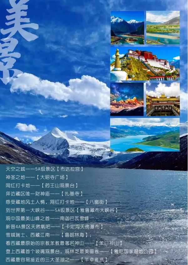 青藏9日游 聊城發(fā)團 純玩 無購物 西寧 拉薩 布達(dá)拉宮 藥王山觀景臺 大昭寺廣場 八角街 卡定溝 雅魯藏布大峽谷 尼洋河景觀帶 南迦巴瓦雪峰 ...... 發(fā)團日期 20230616 20230620 價格 4588 報名電話 0635 8681234