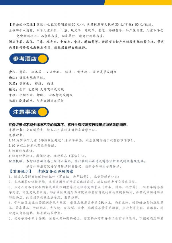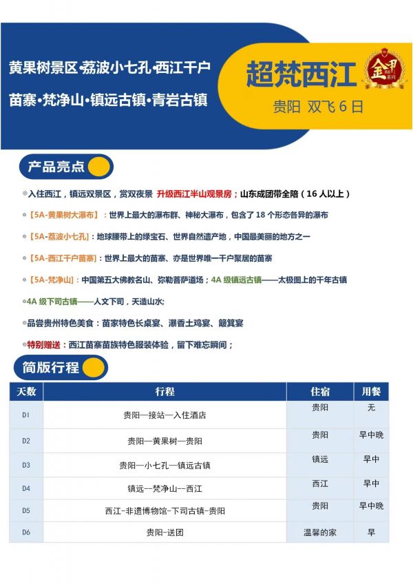 貴州6日游 聊城發(fā)團 純玩 無購物 貴陽 黃果樹 小七孔 鎮(zhèn)遠古鎮(zhèn) 梵凈山 西江 非遺博物館 下司古鎮(zhèn) 發(fā)團日期 20230619-20230624 價格 3680 報名電話 0635 8681234