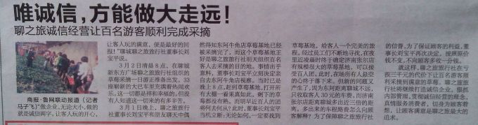 3月2日清晨8點(diǎn),在聊城新東方廣場(chǎng)聊之旅旅行社組織的草莓采摘一日游正準(zhǔn)備出發(fā)。33座嶄新的大巴車(chē)?yán)锍錆M(mǎn)著熱鬧歡樂(lè)。這一切都是祥和幸福的。但沒(méi)有人知道這一切來(lái)的有多辛苦。