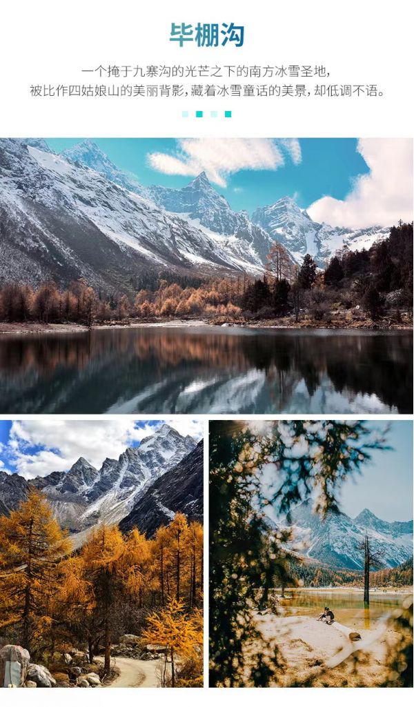 有“四姑娘山后花園”美譽(yù)的畢棚溝(不含景區(qū)觀光車60元/人-上行游客中心-龍王海/下行娜姆湖酒店-游客中心),溝內(nèi)有原始森林、絢麗多彩的植被、雪山溫泉,景觀豐富,一年四季各有各的美。初春時(shí)節(jié)斑駁著枯色的山林正漸漸蘇醒,枝丫生出新的綠色希望,溪流才開始解凍,半冰半水潺潺流動(dòng),垂卷而下的百米瀑布如白砂裹雪;夏季,那些綠的希望已匯成一片汪洋,瀑布喧鬧得歡騰而下,踱步原始森林中蜒曲的小道,遠(yuǎn)眺藍(lán)天高山,奇特的萬(wàn)年冰川,感受城市中沒有的舒爽;