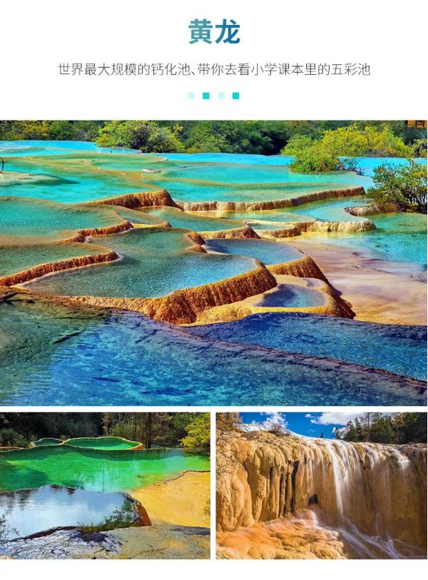【黃龍風(fēng)景區(qū)】因其獨(dú)特的景觀、原始的生態(tài)和豐富的資源被美稱為“人間瑤池”,在這里我們可以親身體驗(yàn)到“彩池、灘流、雪山、峽谷、古寺、民俗”六絕的獨(dú)特魅力。黃龍風(fēng)景區(qū)鈣化景觀非常壯觀,鈣化邊石壩彩池、鈣化灘、鈣化扇、鈣化湖、鈣化塌陷湖、坑,以及鈣化瀑布、鈣化洞穴、鈣化泉、鈣化臺(tái)、鈣化盆景等一應(yīng)俱全,是一座名副其實(shí)的天然鈣華博物館。乘坐索道后,我們繼續(xù)沿觀光道往景區(qū)最高點(diǎn)——五彩池、黃龍寺方向徒步,再順著游客道便能走出景區(qū);體力有限的游客也可以選擇不行返回索道口,自費(fèi)乘坐索道離開景區(qū)。