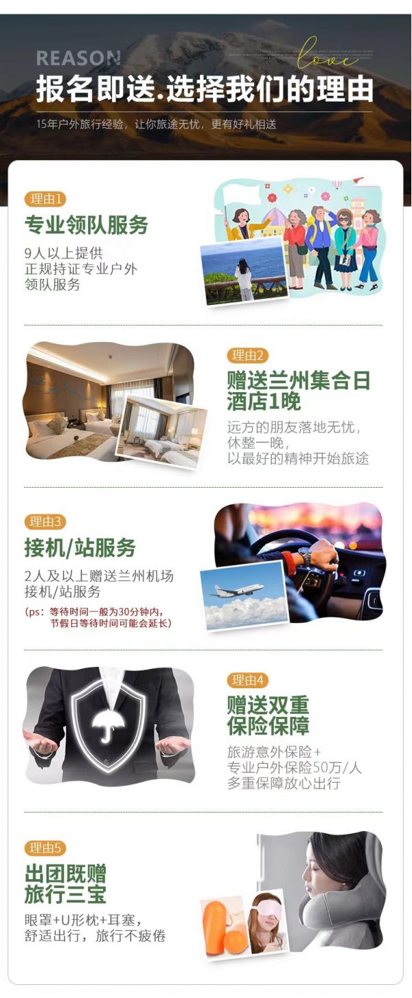 (5)贈(zèng)送2人及以上蘭州市區(qū)接火車服務(wù);4人以上接機(jī)服務(wù),23點(diǎn)后由于運(yùn)管規(guī)定不能接機(jī)/接站,敬請(qǐng)諒解;服務(wù):9人及以上,提供持證正規(guī)導(dǎo)游服務(wù);8人及以下,由經(jīng)驗(yàn)豐富的司機(jī)帶隊(duì),無(wú)單獨(dú)導(dǎo)游服務(wù),請(qǐng)諒解。保險(xiǎn):贈(zèng)送高額旅游意外保險(xiǎn),旅游意外保險(xiǎn)最高賠付50萬(wàn)元/人,贈(zèng)送旅行社責(zé)任險(xiǎn),贈(zèng)送車輛保險(xiǎn);因道路交通事故造成的客人意外傷害,按《道路交通事故處理方法》由保險(xiǎn)公司賠償,我方不承擔(dān)另外的賠償責(zé)任;如有需要,游客可自行購(gòu)買其他保險(xiǎn)。