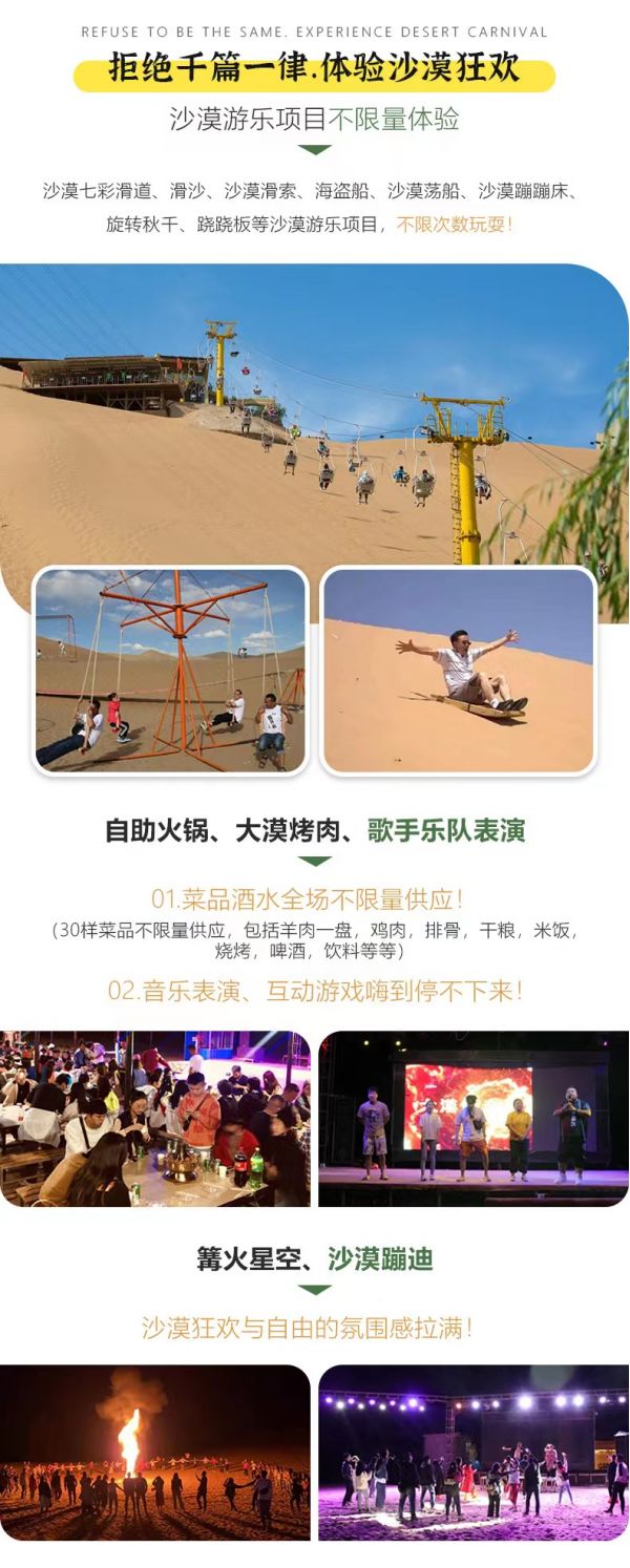 今晚我們將在此開(kāi)啟沙漠狂歡party!坐上沙漠摩托、沙漠越野,專業(yè)騎手、專業(yè)裝備帶你來(lái)一次刺激的沙漠沖沙體驗(yàn),在沙漠中放聲尖叫;還有沙漠七彩滑道、滑沙、沙漠滑索、海盜船、沙漠蕩船、沙漠蹦蹦床、旋轉(zhuǎn)秋千、蹺蹺板等沙漠游樂(lè)項(xiàng)目讓你嗨翻沙漠。日落之后沙漠盛宴來(lái)襲,自助火鍋、大漠烤肉......菜品酒水全場(chǎng)不限量供應(yīng)。沙漠夜宴進(jìn)行時(shí)還有演員歌手表演節(jié)目,做互動(dòng)游戲。吃飽喝足,酒氣微醺,在沙漠縱情享受一場(chǎng)篝火晚會(huì)、沙漠蹦迪,沙漠狂歡與自由的氛圍感拉滿??駳g結(jié)束后,需要沙漠露營(yíng)的客人開(kāi)始領(lǐng)取露營(yíng)裝備(包括帳篷,棉被),不露營(yíng)客人,返回酒店休息。