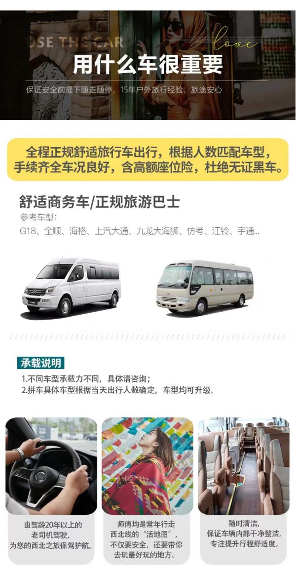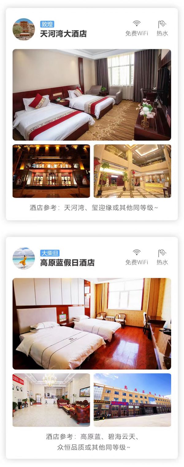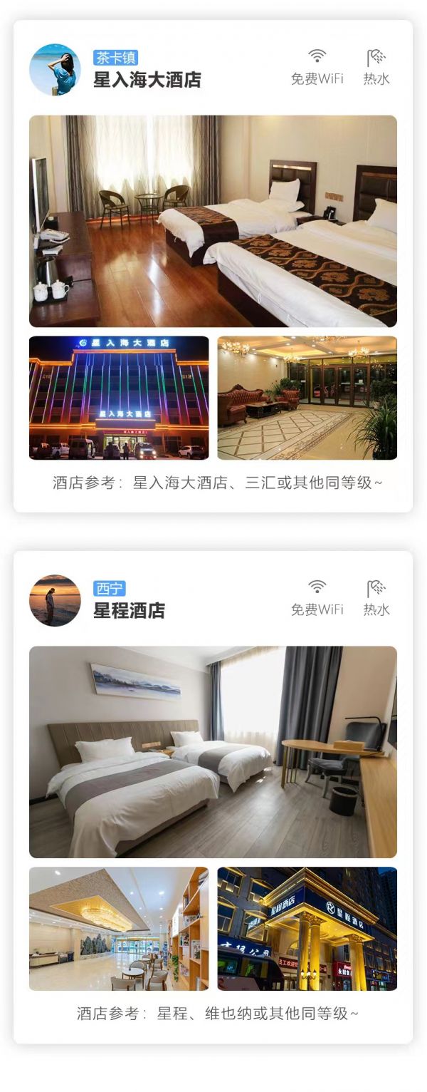 全程正規(guī)舒適旅游巴士,保證一人一正座位,車型大小根據(jù)實(shí)際人數(shù)安排,且由駕駛經(jīng)驗(yàn)豐富的司機(jī)為您的出行保駕護(hù)航(報(bào)價(jià)包含車費(fèi)、油費(fèi)、停車費(fèi)、維修費(fèi)及司機(jī)勞務(wù)費(fèi))。住宿:行程所列7晚住宿。我們會(huì)提供行程內(nèi)展示照片的酒店或其他條件相似酒店,但因沿途條件有限,如酒店設(shè)施達(dá)不到您的期望,請(qǐng)您諒解。參考酒店如下: