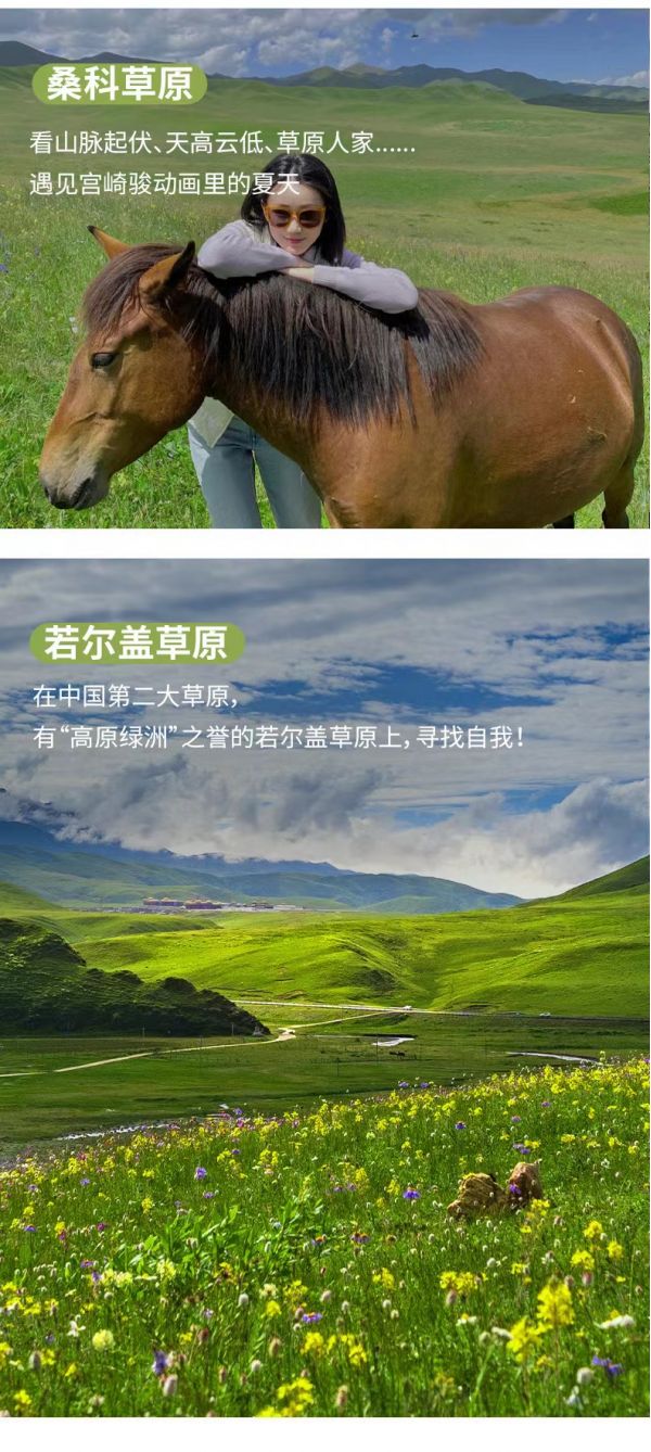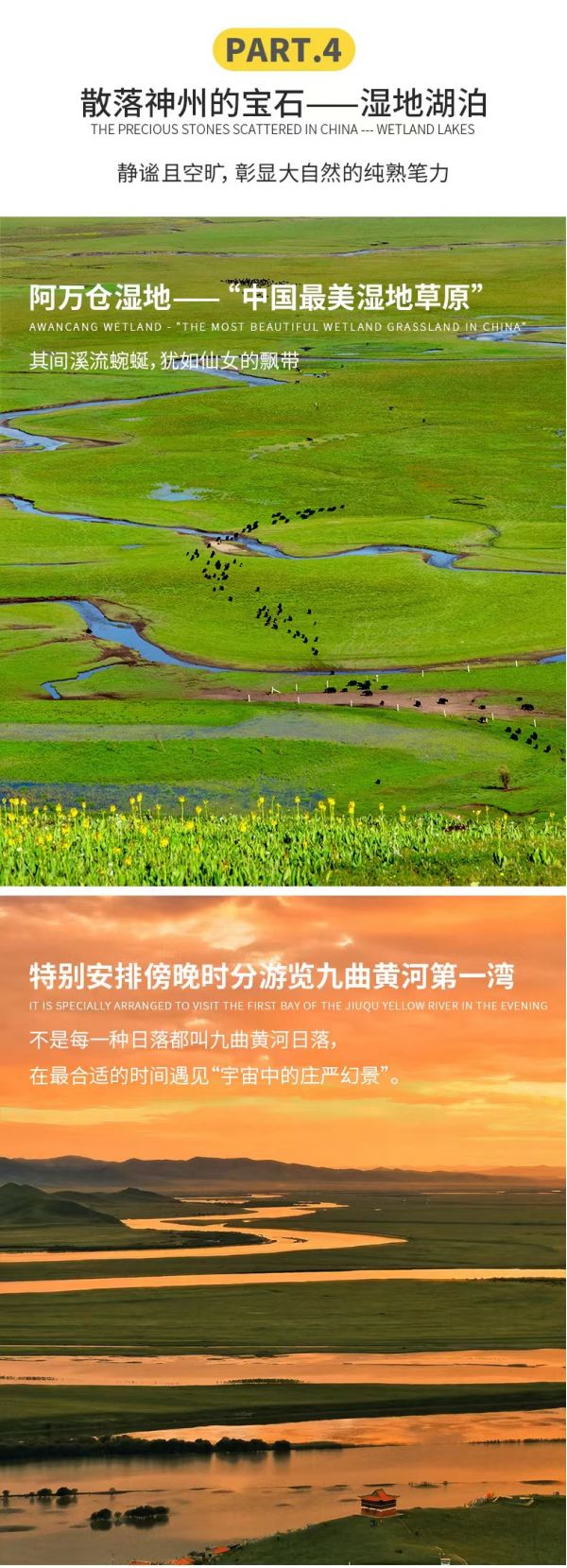 繼續(xù)行程,我們將來到“中國最美濕地草原”——【阿萬倉濕地】,這片濕地臥在甘肅省南部黃河的臂彎里,黃河自西向東從青海久治進入瑪曲木西合,因水瀉不暢而形成很多汊河和沼澤,使這片廣袤的草原水草豐茂、牛羊肥壯。這里地處偏遠,但也正因他的閉塞,才造就了這片世界遺落的草原的幽美浩瀚,彎曲的河流,登上觀景臺,俯瞰一望無垠的阿萬倉濕地,散落的牦牛、潔白的羊群在茵茵草場上星羅棋布,沼澤在陽光下泛著粼粼光波,如同一幀靜止的電影畫面,閑逸至極。從阿萬倉濕地驅(qū)往阿壩的途中我們會途經(jīng)??撇菰怄i車觀桑科草原的新視角、新體驗。