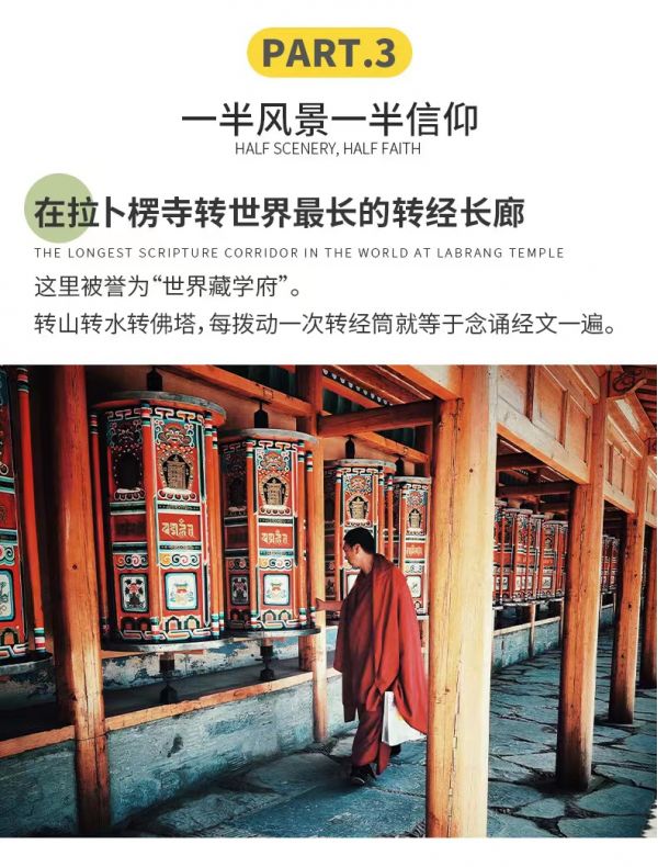 繼續(xù)往前【拉卜楞寺】,有“世界佛學院”之稱的【拉卜楞寺】。拉卜楞寺是藏傳佛教格魯派六大宗主寺之一 , 規(guī)模僅次于布達拉宮,是藏傳佛教格魯派最高佛學學府之一,被世界譽為“世界藏學府”,相當于我們眼中的“清華北大”。在漫長的發(fā)展中拉卜楞寺形成了獨特的藏傳佛教文化,包括建筑、學院、法會、佛教藝術、藏經(jīng)等,曾經(jīng)是甘、青、川毗鄰地區(qū)藏族的政治、宗教、文化中心。在學院堪布的帶領下來,進入寺院,欣賞美麗的壁畫、唐卡,精美佛像;走過朱紅玄黃長廊,和喇嘛一起撥動轉(zhuǎn)經(jīng)筒;在這紅白相間的宏偉寺院中,看虔誠的信徒磕著等身長頭來此轉(zhuǎn)經(jīng);與僧人一起聽經(jīng)、打坐,靜靜感受這份信仰的力量。而后經(jīng)過【瑪曲】,母親河黃河這里自西南入境,復從西北出境。