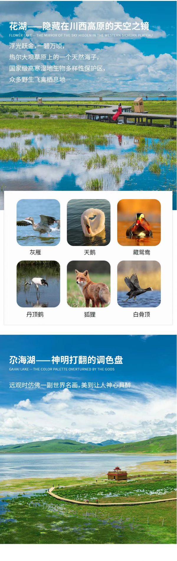 然后我們前往草原湖泊【花湖】。在僅次于呼倫貝爾草原的熱爾大壩草原之上,有一個絕美的天然海子---花湖。花湖濕地屬于國家級高寒濕地生物多樣性保護區(qū),是眾多野生飛禽的主要棲息地,如灰雁、白骨頂、天鵝、黑頸鶴、丹頂鶴、藏鴛鴦、狐貍等?;ê南奶旌颓锾靹e有一番風味。夏天,號稱“天空之境”的花湖,周邊開滿野花,美輪美奐。秋天,廣闊的草原變成一片金黃,藍色的花湖被包圍其中,仿佛金色地毯上的一顆藍寶石。湖邊建有木質(zhì)棧道,一直延伸到水中,可以沿著棧道走到濕地深處,沿途都可以找到拍大片的好角度。