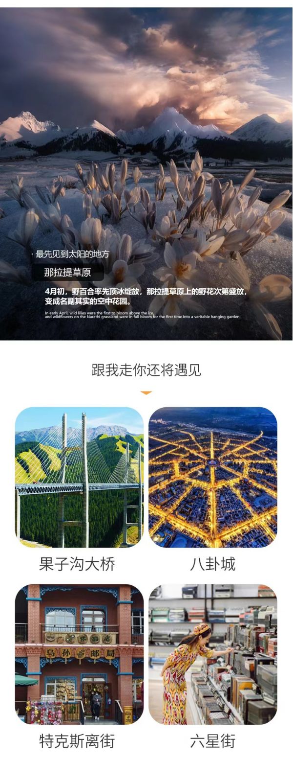 用完早餐后,前往【賽里木湖景區(qū)】,是新疆境內(nèi)面積最大的高山內(nèi)陸湖泊,又是大西洋暖濕氣流最后眷顧的地方,因此有“大西洋最后一滴眼淚”的說(shuō)法。賽里木湖集雄奇、秀麗、壯闊于一身,一年四季都能看到不一樣的美景。春天冰雪融化,春暖花開;夏天草長(zhǎng)鶯飛,花海如潮;秋天天高地闊,蒼茫唯美;冬天千里冰封,萬(wàn)里雪飄,清代著名學(xué)者洪吉亮將其贊嘆為“西來(lái)之異境,世外之靈囊”。沿著湖邊的公路一路向前,每個(gè)??康恼军c(diǎn)都不容錯(cuò)過(guò)??死沼恐椋吧蠲赖牡胤?,也是婚紗攝影的勝地;成吉思汗點(diǎn)將臺(tái)是攝影愛好者的天堂,在這里可以一覽賽里木湖全景;五月中旬到七月初的海西,滿山遍野的野花;公路照、湖泊照、雪山照隨意一拍都是你想要的大片。拍夠了便乘車?yán)^續(xù)繞湖前行。愛好徒步者可沿著木棧道在湖邊漫步。乘車前往清水河,穿越有著“伊犁第一景”的果子溝,跨越雄偉壯觀的果子溝大橋,探尋天山腹地美景。果子溝是伊犁地區(qū)的天然門戶,北上賽里木湖,南下伊犁河谷,自古以來(lái)就是進(jìn)出伊犁地區(qū)的重要通道?!玖墙帧?這可是出文藝片的地方,它是伊寧市的一個(gè)古老街區(qū),始建于上世紀(jì)30年代中期(1934-1936年),像蜘蛛網(wǎng)格一樣,也是俄羅斯族人聚居的地方,建筑風(fēng)格也具有獨(dú)特的俄羅斯風(fēng)情。漫步在街道上沿街拍攝各種風(fēng)格、各種顏色的小院和建筑,感受當(dāng)?shù)鼐用褓|(zhì)樸的生活。