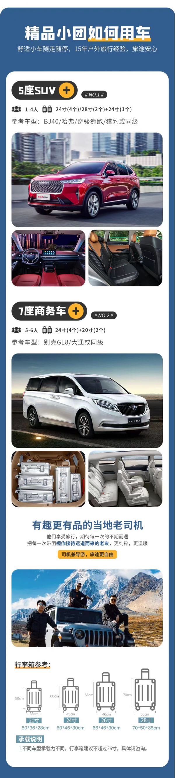 交通:2-6人VIP私享小團全程舒適SUV/商務(wù)車出行;車型大小根據(jù)實際人數(shù)安排,且由駕駛經(jīng)驗豐富的司機為您的出行保駕護航,報價包含車費、油費、停車費、維修費及司機勞務(wù)費。