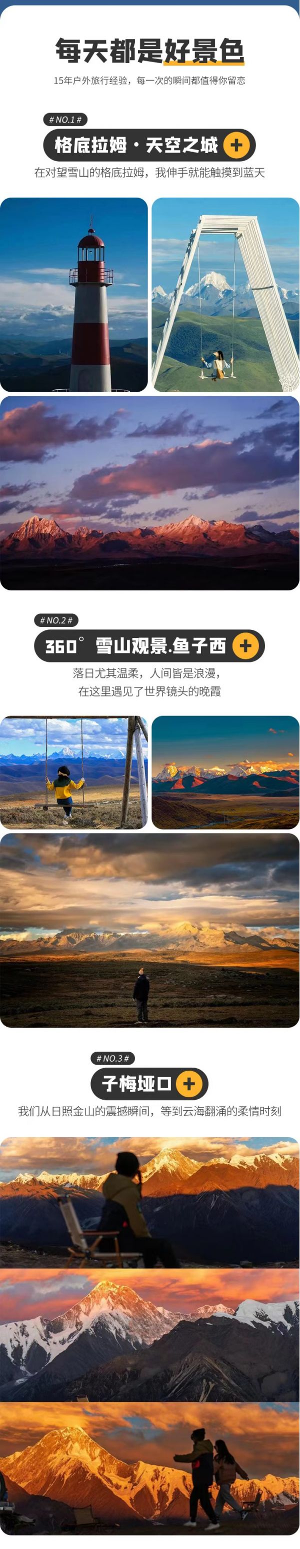 2、若格底拉姆·天空之城、魚子西因下雪或者管制需要中轉(zhuǎn)車進入,費用自理。若領(lǐng)隊陪同上山,中轉(zhuǎn)車費客人負責(zé)AA。如果魚子西森林防火期間則取消,在格底拉姆看日落。