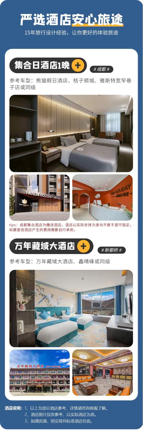 住宿:成都酒店標間1晚(tips:成都集合酒店為贈送酒店,酒店以實際安排為準均不換不退不指定,如要更改酒店產(chǎn)生的費用需要自行承擔(dān)。),新都橋酒店標間2晚,上木居/玉龍西客棧標間1晚 (冷噶措住宿條件有限,請謹慎報名)(僅供參考,實際以訂房為準):