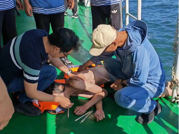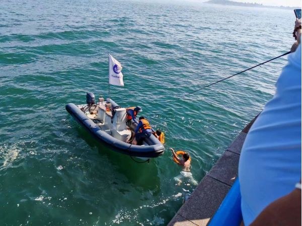 據(jù)了解,三名落水者均是大學(xué)生,一名大學(xué)生先落水,兩名學(xué)生先后去救助均遇險。當時海上風大水涼,一名落水者已經(jīng)失去意識,另外兩名也體力嚴重透支。在聽到呼救聲時,銀海格曼海上交通娛樂中心經(jīng)理賈平正在碼頭工作,憑借多年海上救援的經(jīng)驗,他立刻安排帆船部經(jīng)理焦寅生、船長劉海天兩人駕艇迅速前往落水者海域?qū)嵤┖I暇仍?,并用對講機全程指揮了海上救援過程。當時,兩名船長拋出救生圈后,先將處于昏迷狀態(tài)的青年營救上船進行控水急救,隨后將另外兩名落水者營救上岸,整個海上救援總共用時三分鐘。三名落水者被救上岸后,等在岸上的賈平和船長王其剛立即對落水者實施搶救,直至三名學(xué)生最終恢復(fù)生命體征,脫離危險。在場目睹救人的市民和游客對這種見義勇為的行為紛紛點贊拍手叫好。