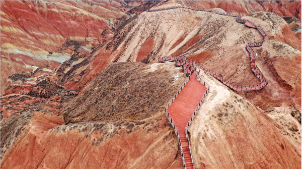 沿著棧道蜿蜒向上,隨著視角逐漸抬高眼前的水墨丹霞景區(qū)美景,絲路霞光、九色丹青、丹頂攬勝,更遠(yuǎn)方景區(qū)的天際線盡收眼底。